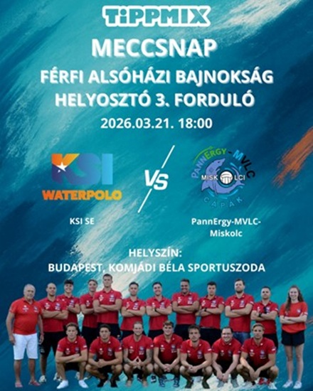2026.03.20. 2026.03.20.Kategória HírekE.ON Férfi OB I. Alsóházi Bajnokság Helyosztó 3. fordulóIdőpont: 2026.03.21. 18:00, Helyszín: Budapest, Komjádi Béla Sportuszoda, KSI SE – PannErgy-MVLC-Miskolc