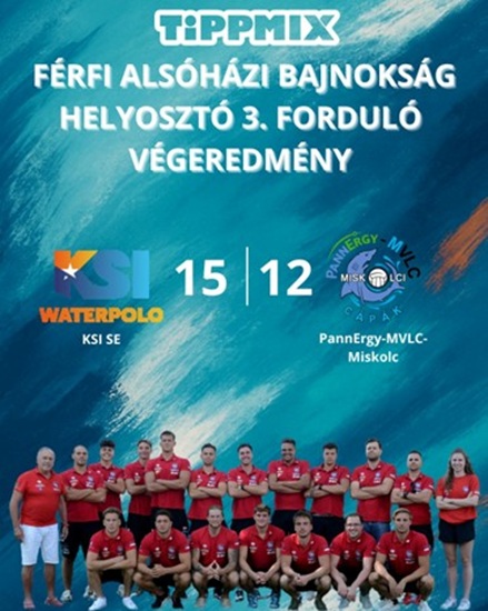 2026.03.23. 2026.03.23.Kategória HírekE.ON Férfi OB I. Alsóházi Bajnokság Helyosztó 3. fordulóVégeredmény: KSI SE – PannErgy-MVLC-Miskolc 15 – 12, Góllövők: Várkonyi 4, Dubinák 3, Gusakov 2, Szabó István, Szabó Bence, Némethy 1-1